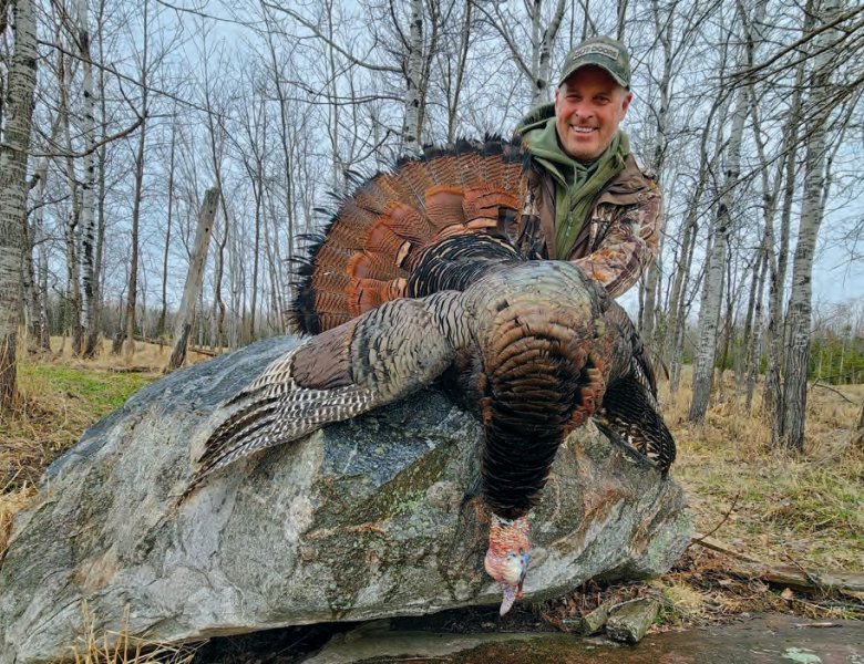 Aussitôt, le dindon étira le cou en tournant la tête, le moment que j’attendais pour presser la détente! Subitement terrassé, l’oiseau battit faiblement de l’aile deux ou trois fois avant de demeurer complètement inerte. C’est le cœur battant que je m’approchai pour admirer de près la magnifique prise, avec sa longue barbe et les grand séperons de ses pattes. Le vieux guerrier avait finalement été leurré par une utilisation mixte de différents appeaux et ainsi attiré vers l’appelant et à portée de mon arme. J’en ressentais particulièrement une grande fierté !